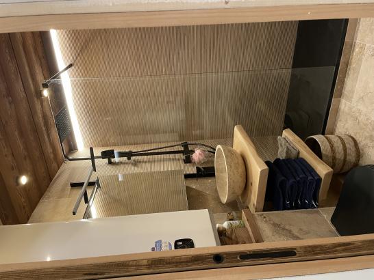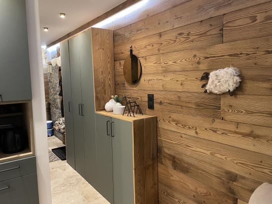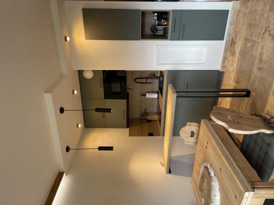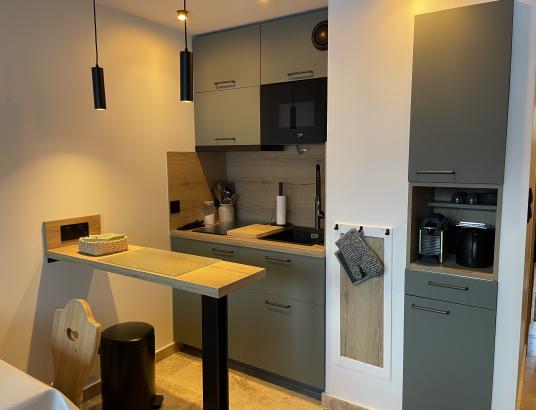 Coin cuisine avec microondes, réfrigérateur, plaque induction, mini lave-vaisselle, cafetière Nespresso, bouilloire, grille-pain, raclette et fondue.